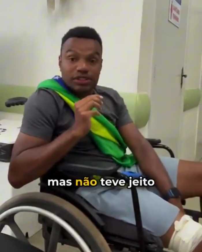 Imagens publicadas nas redes sociais mostram Holiday em uma cadeira de rodas, com o pé enfaixado, durante o atendimento médico.