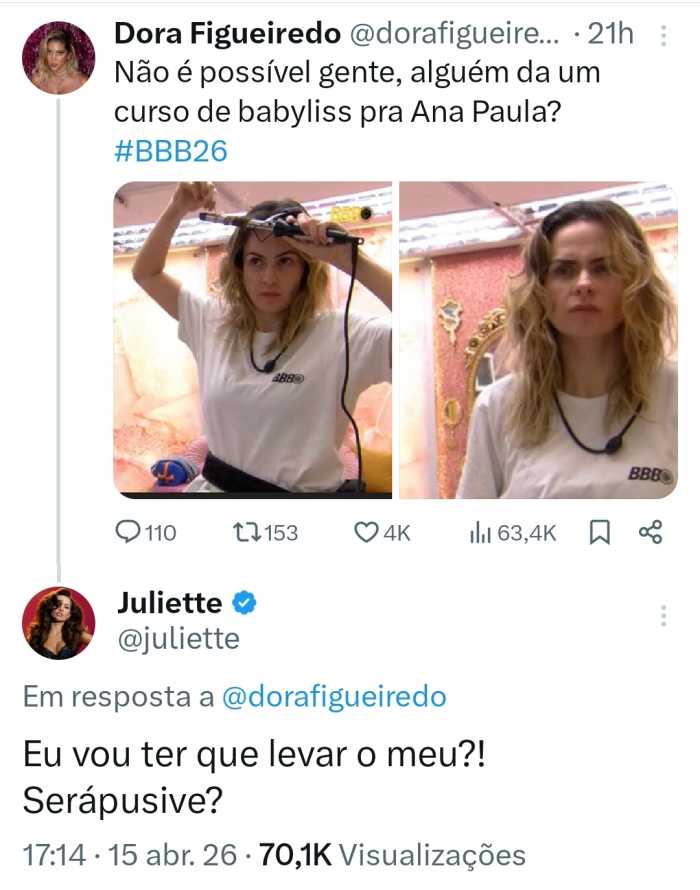 O conteúdo foi publicado por uma conta nas redes e rapidamente gerou reações. Juliette entrou na brincadeira e respondeu: “Vou ter que ensinar com o meu, né?!”. Em seguida, também comentou: “Eu vou ter que levar o meu?! Serápusive?”